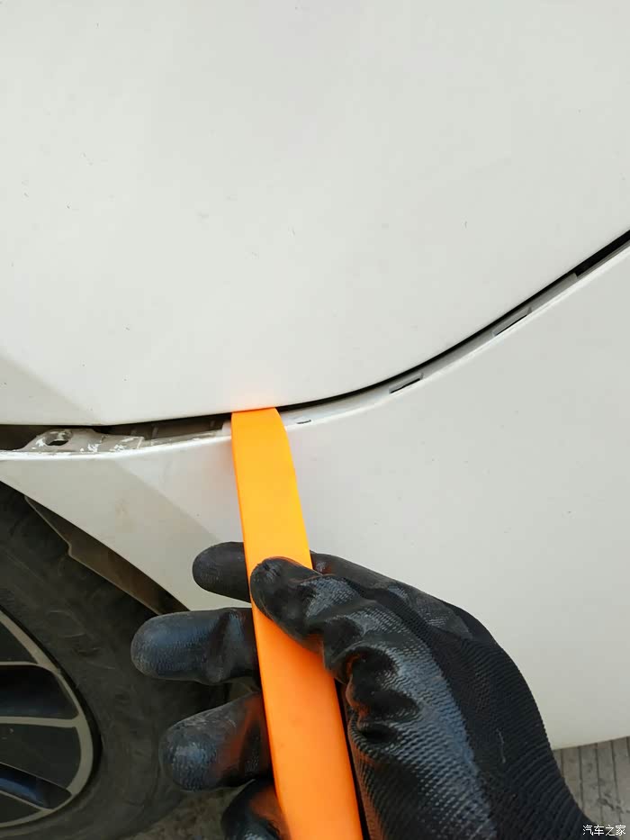这玩意爱好折腾的车友应该都有吧,开始沿着后轮内衬那个位置撬吧。