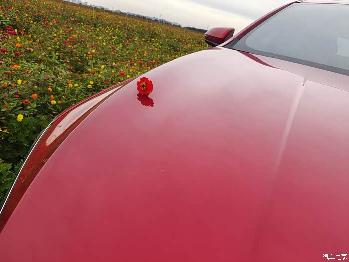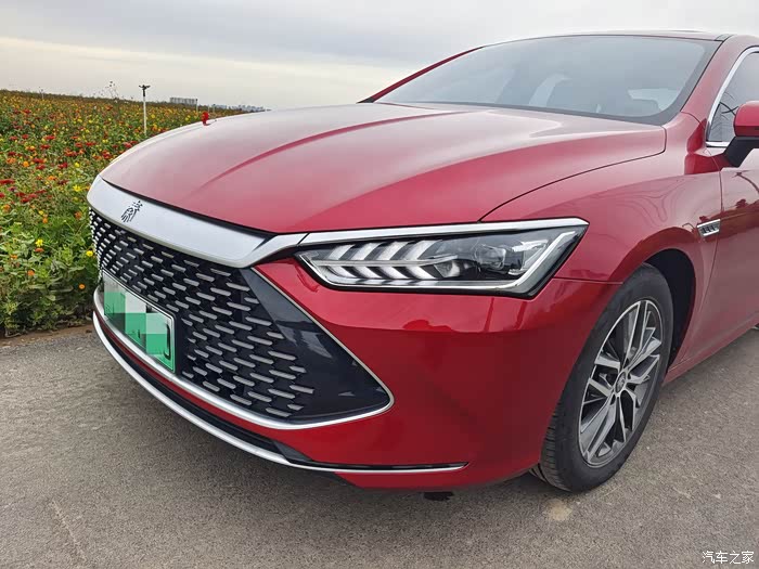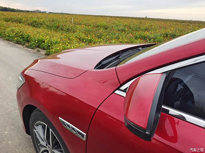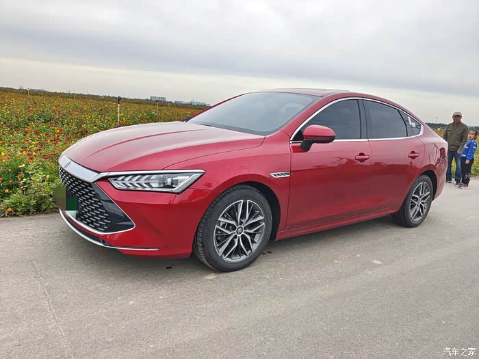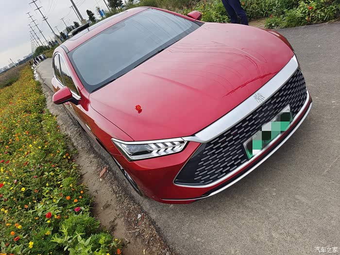 你看在花海里小秦显得格外耀眼,旁边的游客们都忍不住过来看几眼,我觉得颜值还是很高的,用官方的话叫龙脸造型,犀利的鹰眼大灯,修长的流线身形,特别帅气。