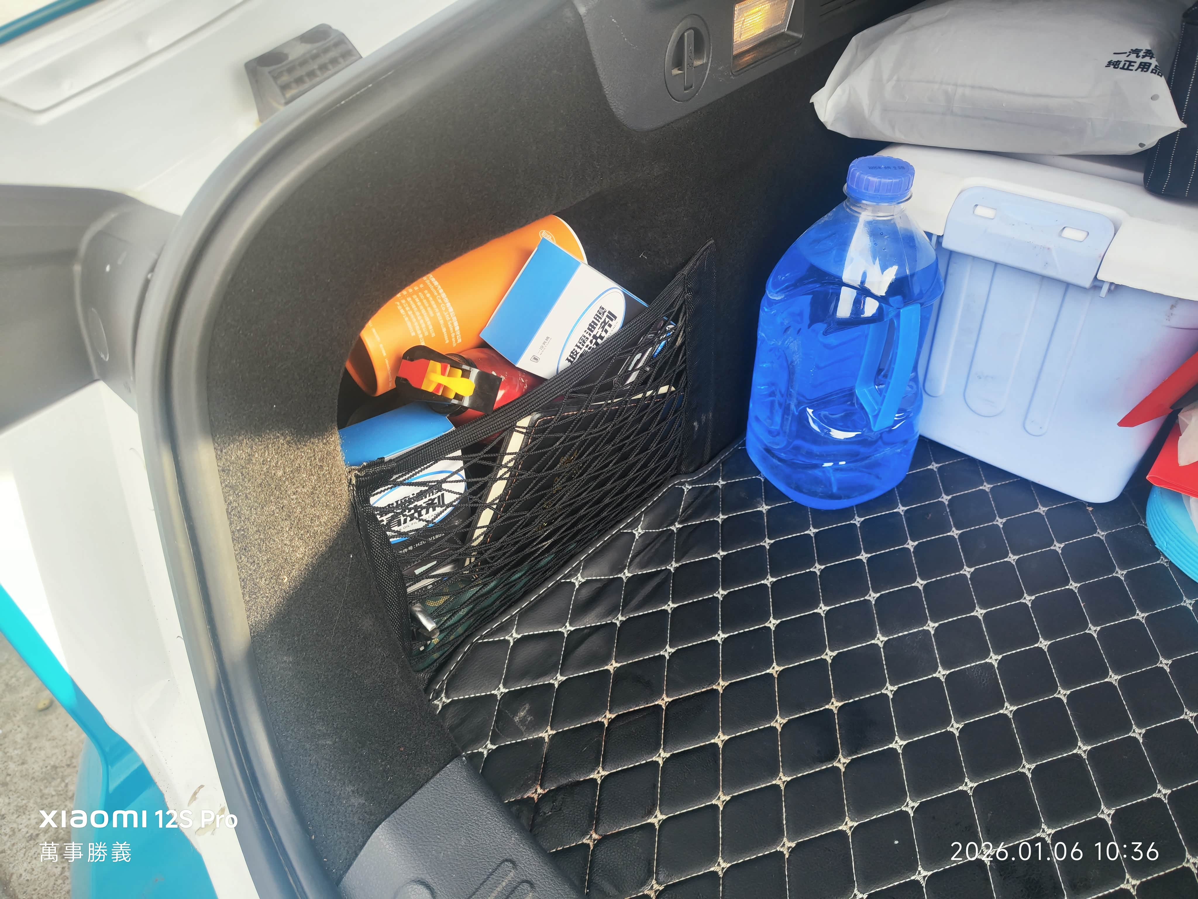 后备箱尾部两侧均为内凹式设计,网购了弹力小网兜粘贴后可以放置一些小物品,很是方便。