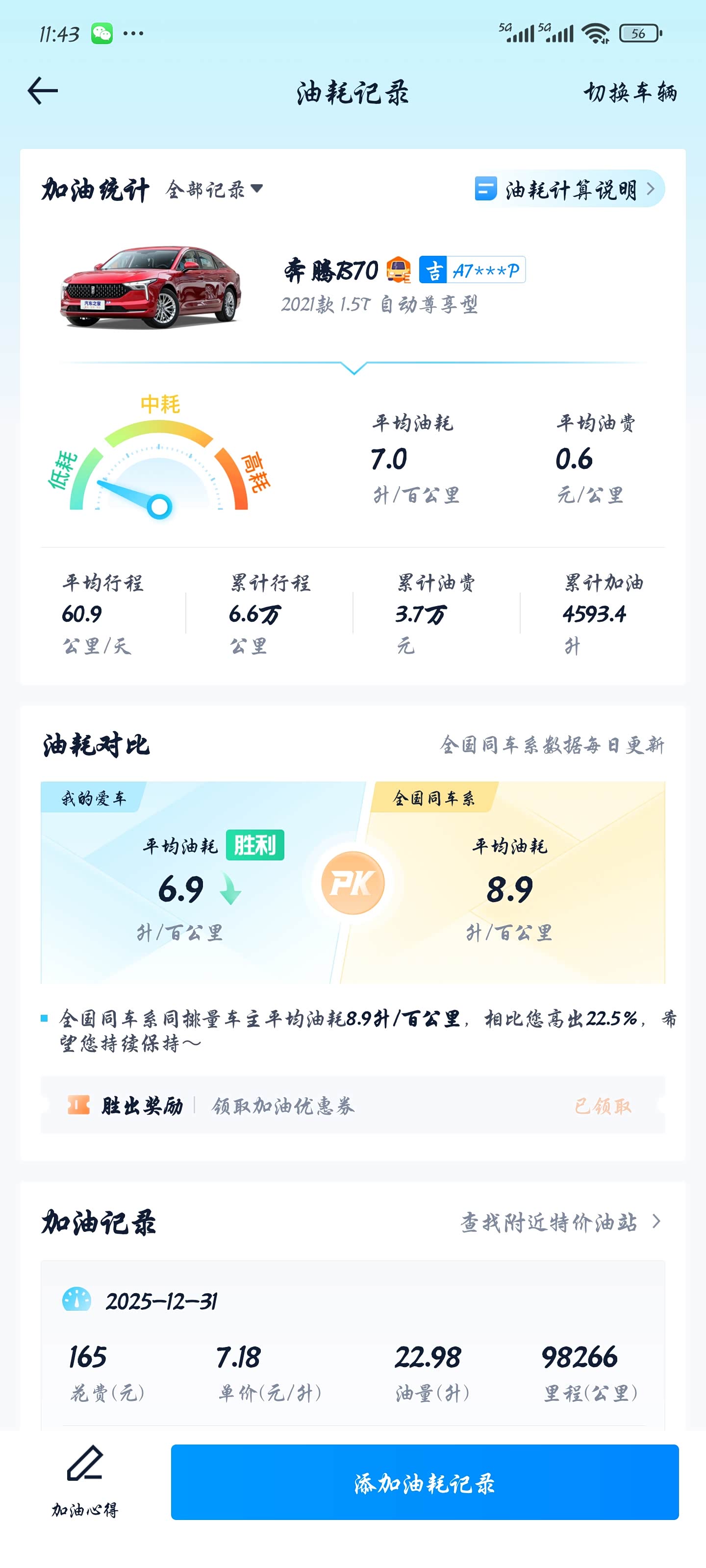 之家记录油耗以来行驶里程6.6万公里,平均油耗7升/百公里。