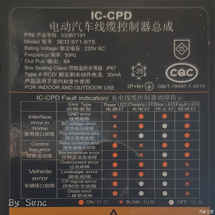 随车充学名”电动汽车线缆控制器总成“,详细的图解供各位参考,参数和亮灯表示的意思很直观,我就不一一说明了。对于还没入手的准车主来说,这张图可以对这个随车充有一个非常准确的了解。在买车前,我也特意跑到4S看这个设备的参数。