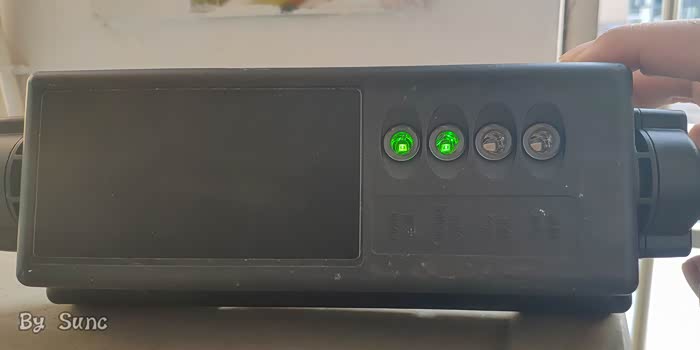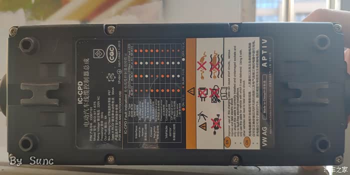 这是随车充变压器部分的正面照,买车前只看到未通电的装备,原以为左边大大的黑色亮块可以显示充电时的状态,电流值这些,其实完全没有,只有右边四个灯,对应相应的说明。