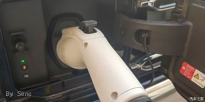 另一头有个卡口,与汽车的充电接口对接,充电时照片左边的绿灯明暗间歇,且可以听到汽车内部有散热风扇在工作。