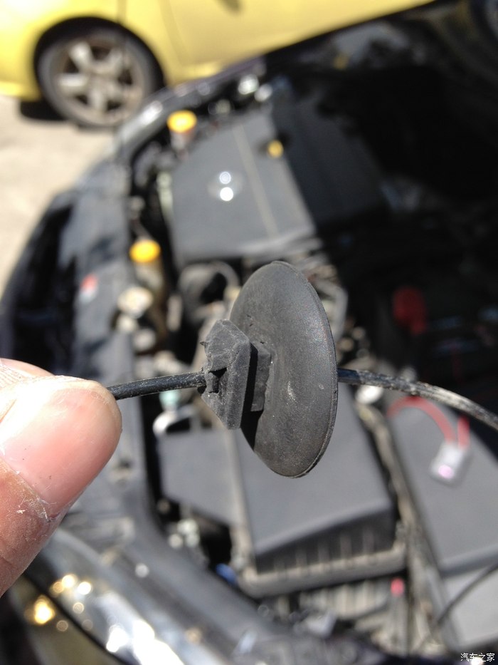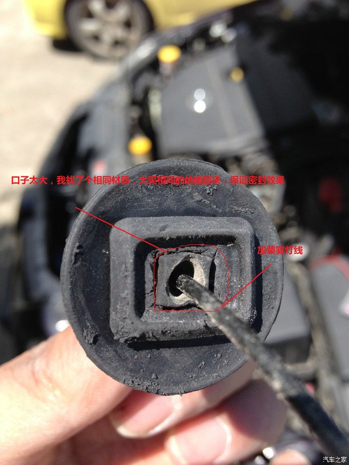 这根黑色的线就是加装的雾灯线,足足有1.5平粗,是巨靠谱的耐高温线。之前也是错觉说我原来的雾灯线束耐高温性差,我才有了这样的念头。这圆形的,就是发动机舱和驾驶舱防火墙上扣(捅)下来的,由于之前中间的空挖太大,我找了个材质类似的给塞起来,保证密封效果。同样,我也用打火机测试过防火效果。