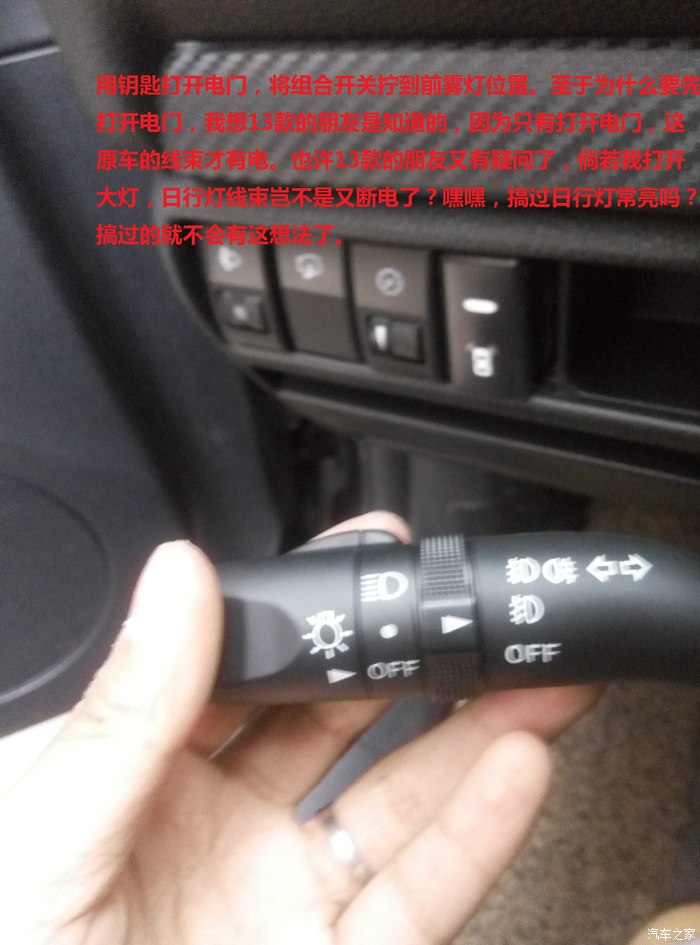 打开电门,把开关拧到前雾灯位置。嘿嘿,为什么要打开电门我就不多说了。