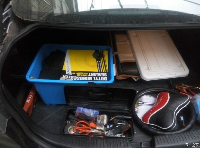 完工后,晒一下我的后备箱。后备箱里有:扳手、螺丝刀、套筒、胶布、剪刀、万用表、腻子套装、各种颜色喷漆、蛇胶等等等等,随车携带。