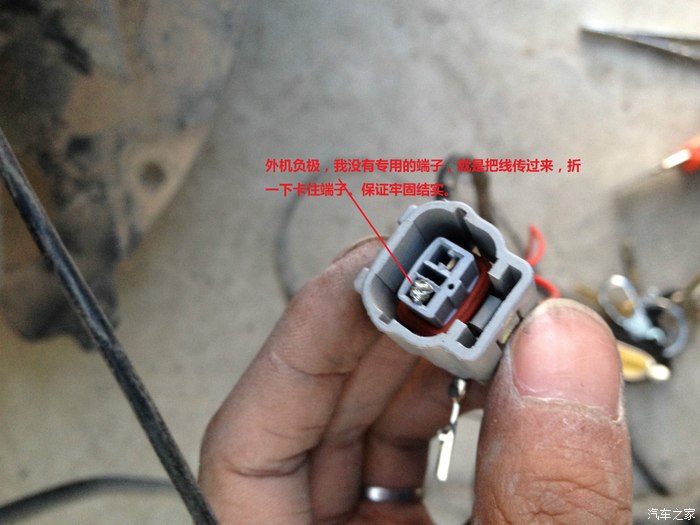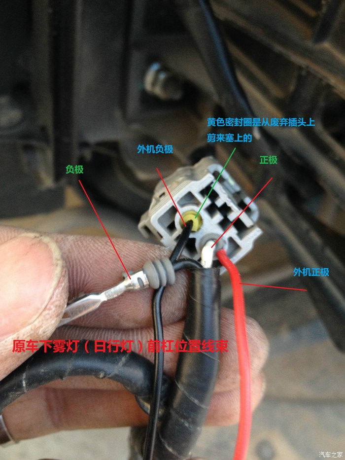 这是原车下雾灯前杠位置的线束的总插头,线束的负极被我挑出来,准备接新拉的雾灯线。另外两条是电子狗分体机的线。我没有用端子,所以分体机负极线塞进去后,屁股会进灰尘之类的。故,我剪了点废弃插头上的橡胶密封套上去给塞起来。分体机正极就缠绕在端子上了。