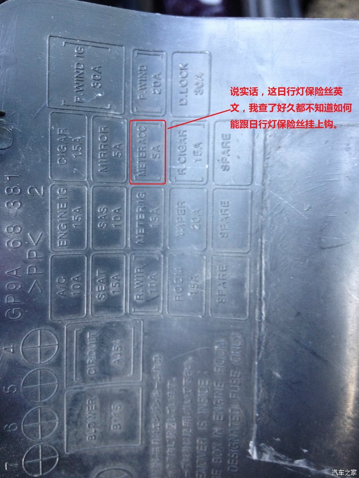 好!!!那么问题来了。原车线束是日行灯,电流肯定小,因此保险丝肯定更小。在第一次测试的时候(入上图并后雾灯测试)直接把保险丝烧了,我用万用表从发动机舱测到BCM这里,才知道万恶的日行灯保险丝,只有5A大,而且那个BCM那个保险丝盖都是英文标识,我们这些英语文盲,谁看得懂。