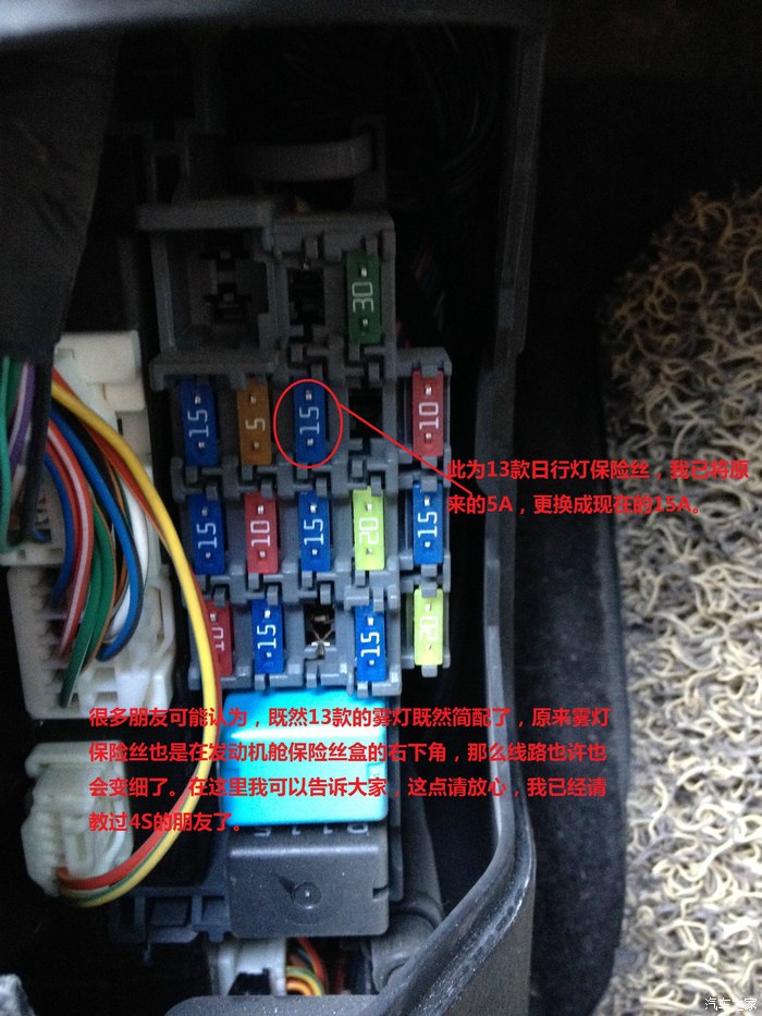 在询问过4S维修部的朋友后,果断换上15A的保险丝。我只知道,为了测试是否安全,周三晚上我大灯和雾灯全部开启,整整开了十几分钟,而且不停得发动机舱和车头来回跑,为的就是看是否会有异常,线束温度是否会升高。其实,保险丝虽小,原车线可不细。