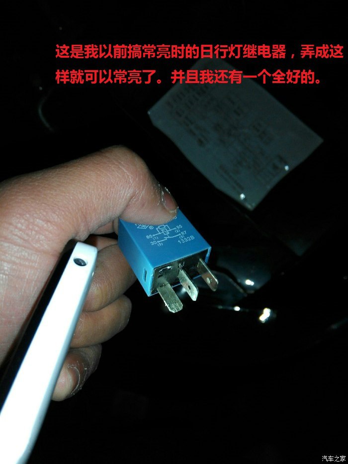 如上图所示,正极走日行灯的正极,把前杠位置的负极挑出来,接加装线束到组合开关。至于这个电子狗,我也是为了隐藏电瓶的线才这么弄的。或许我歪打正着,能让继电器正常工作,否则负极不走继电器过,也是个漏洞。
