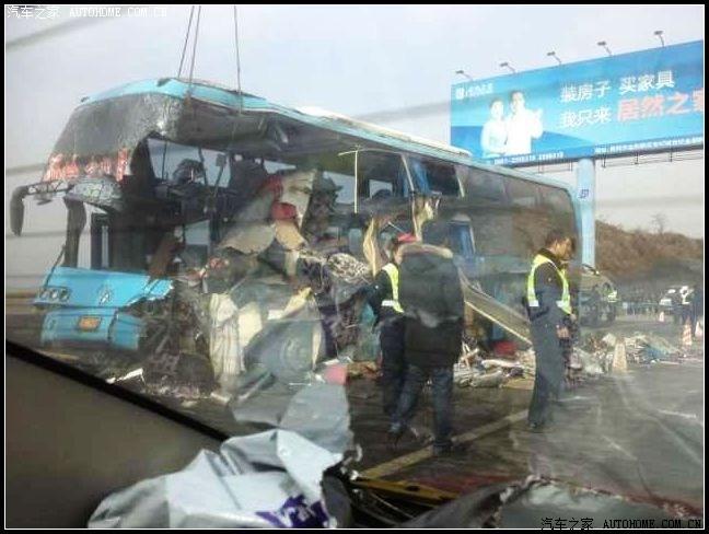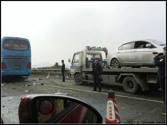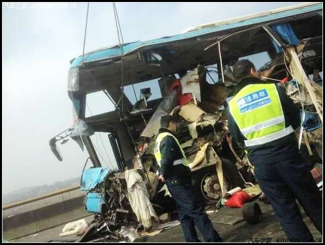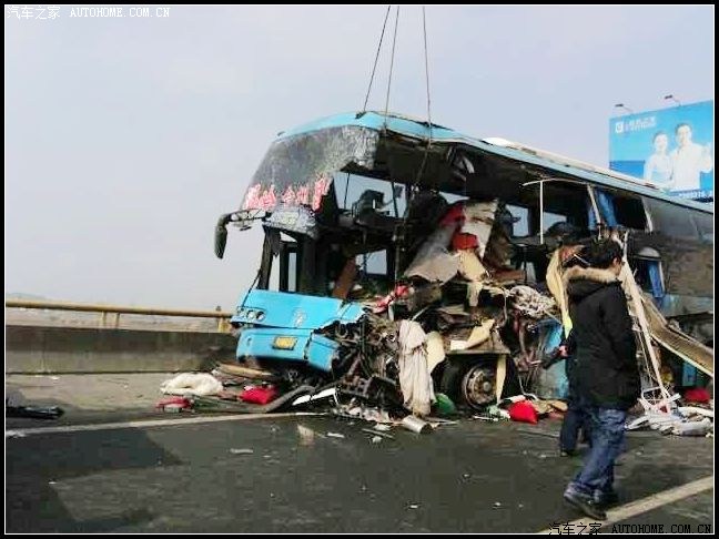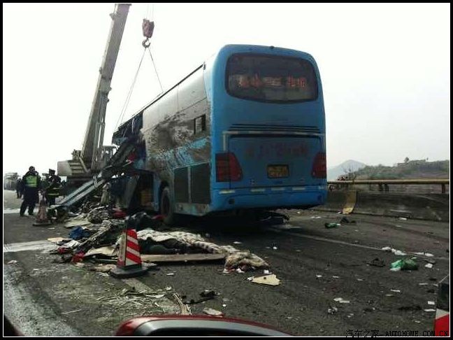 是一辆 温岭——昆明 的长途客车,车祸发生在一段带左转弯的上行路段,可能是车速过快,大客车刚上完长坡就与一辆高速养护车发生相撞!现场非常惨烈!六条鲜活的生命!