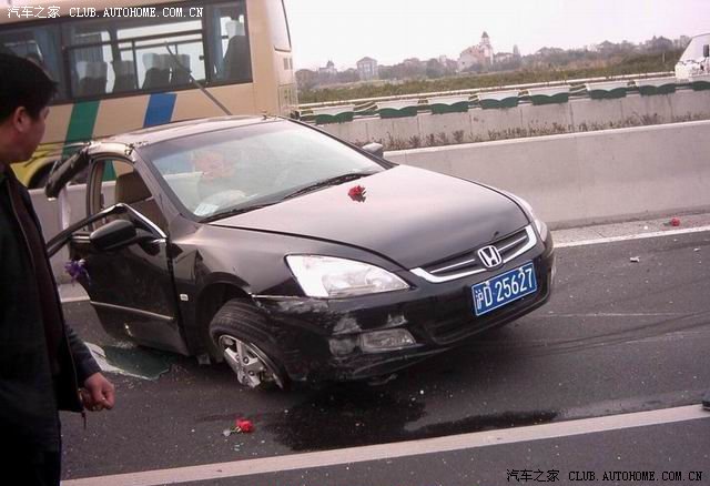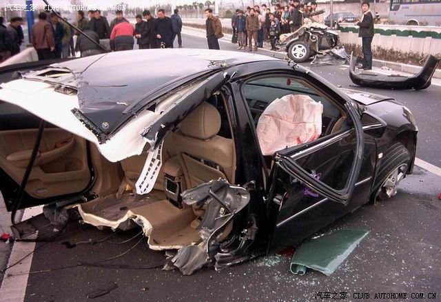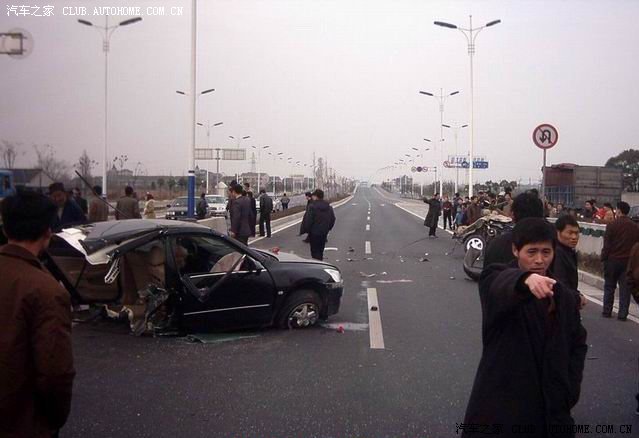 杭州雅阁车事故图片 2005年1月9日下午2时10分左右,杭州石桥镇新郎周先生迎亲的婚车车队中,一辆本田雅阁轿车突然发生车祸,司机为躲避高速公路上的黄狗导致汽车失控,事后雅阁车从中断裂为两截。车祸造成三死两伤。图为车祸现场图片。