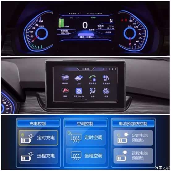 一些车型由于仪表屏尺寸过小,强光下画面不清晰,容易导致驾驶者无法正常查看车辆信息,无形中增加安全隐患。因此,我们根据驾驶者使用习惯,对EX360上搭载的6.2寸液晶化仪表屏进行了合理设计。仪表屏左侧为功率表,右侧为时速表,中间液晶屏幕可同时显示车辆实时功率、小计里程、时速、剩余续航里程、挡位等诸多车辆信息,可以让车主在驾驶过程中免去大量的手动操作,对车辆信息随时一目了然。比如说,通过左侧的功率表指针,车主可以了解车辆当前的能量回收状态,当指针处于功率表绿色区域时,能量回收系统介入,此时车辆续航会有效提升。