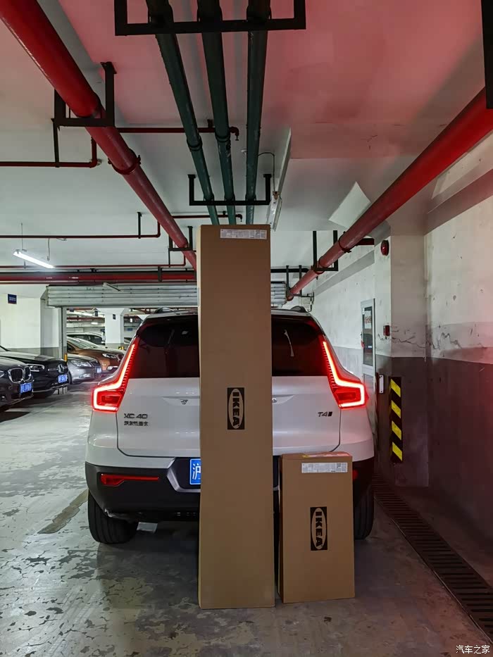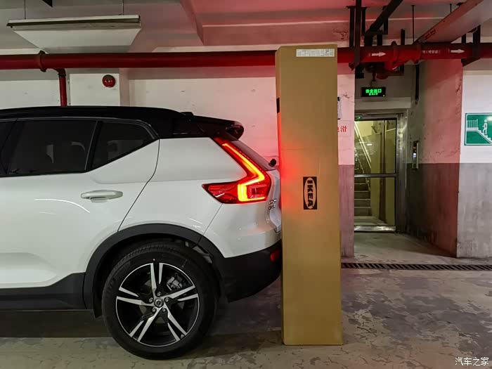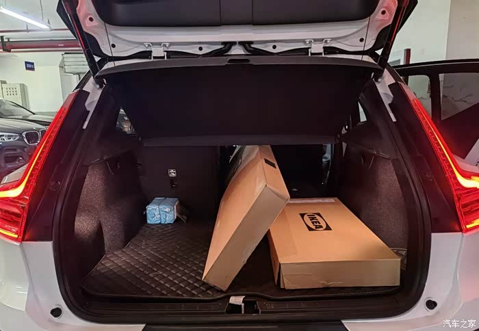 宜家的停车场空间有限,不方便拍摄对比的图片,开车回到家里,特意把货物卸下来作一番对比,沃尔沃xc40车身尺寸是:长4425mm、宽1863mm、高1652mm,轴距为2702mm,可见货物的长度接近1米9。
