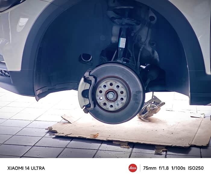 接着拆前轮刹车卡钳,由于卡钳有油管连接,所以要用铁丝将之挂在下摆臂上