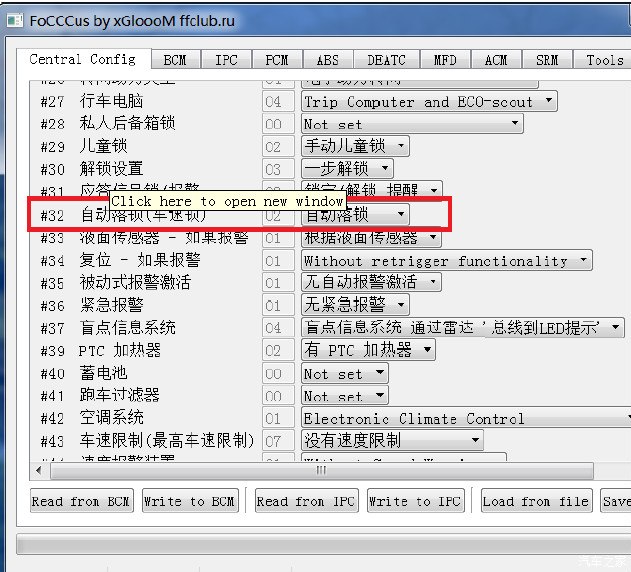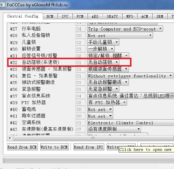 5、好了,这下就简单了。。。。。你可以在软件任意修改了。以刷自动落锁为例,拖动软件显示右侧滚动条,停止到序号#32的位置。原车数据是01,也就是没有行车落锁功能。将序号#32后部的选择框选择为自动落锁,数值变为02,也就是开启行车落锁功能了。其实不论是汉化版还是英文版,大家只要记住一些功能的#XX序号(实际是代表字节位置)以及对应的后方的数值就可以轻松修改了。提醒你的是把想改的项目一次性全部改完。