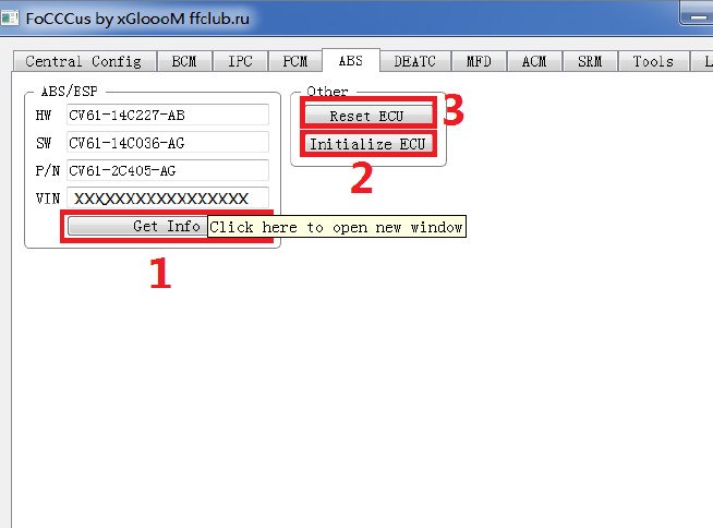 请如此做:点软件顶端的 ABS 选项卡,进入下图的界面。根据下图标出的序号顺序进行分别操作。 先点击“Get Info”按钮,在左上角的 ABS/ESP 框中会显示本车的相关信息; 接着点击“Initialize ECU”按钮进行初始化操作,一分钟之内即可完成,此时仪表盘上行车电脑指示灯不停闪烁,该指示灯灭了之后代表操作完成; 最后点击Reset ECU,重启ABS/ESP系统。