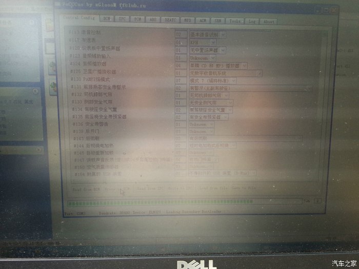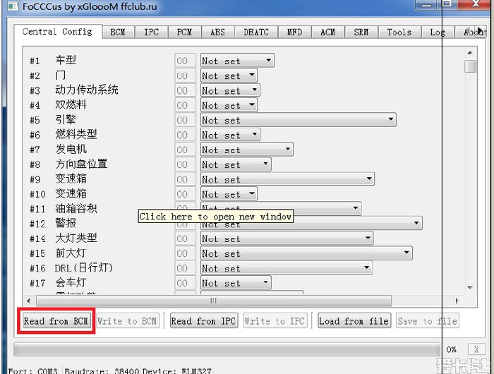4、软件会连接端口并进入下图的界面。点击图中红框中的“Read from BCM”按钮,软件将通过 ELM327 模块直接读取翼虎的行车电脑数据。过程中出现任何警示对话框都直接点掉,重新点击“Read from BCM”按钮,直至软件下面显示进度条到达100%。过程中车辆无论有任何反应你都当没看见就行。。。。