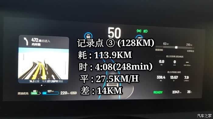 ⑦ 纯油用户在城市开不需要刻意追求高SOC,50~65%根本不用管,掉到50%以下就去快充10分钟就好,充多了也没用。因为纯油用户城市最高也就是在65%±1%徘徊。