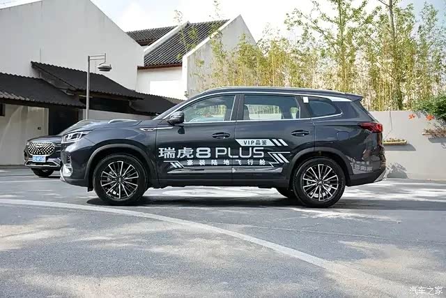 瑞虎8 PLUS的侧面设计同样十分饱满,上扬式的腰线设计带来不少运动感,车窗上线的镀铬条与车门底部镀铬条则为新车带来不少豪华感。此外,车身底部的黑色大包围、滑轨式行李架也进一步凸显其SUV的属性,而前翼子板上的“TGDI”则表示其搭载了涡轮增压发动机。