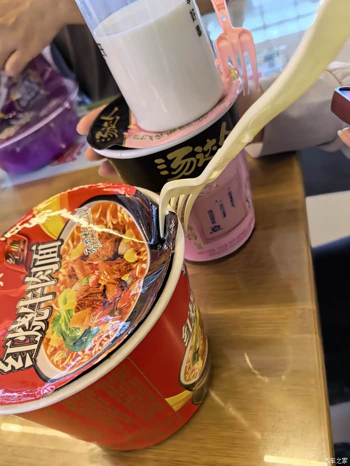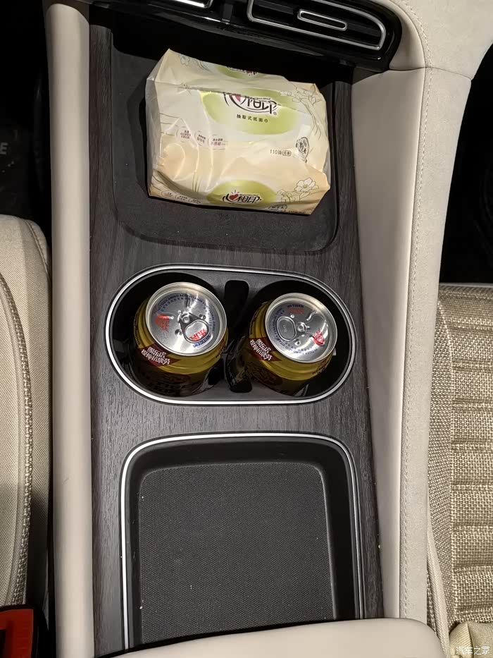 储物盒放杯子的地方很贴心的做成镂空区域。开长途出发前带了2瓶乐虎,就放在储物盒,拿取都很方便。