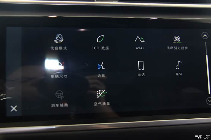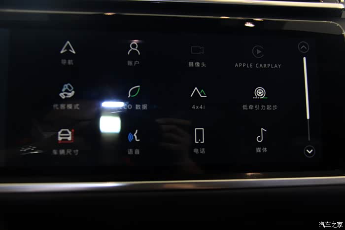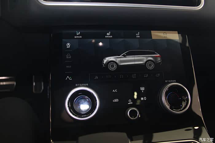 液晶大屏。座椅控制区做了两个实体旋钮。中间那个实体旋钮控制音乐。其他功能都在大屏里。