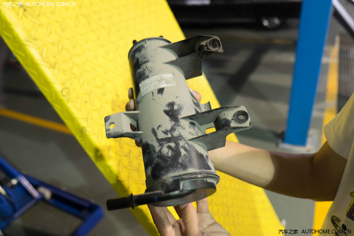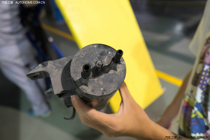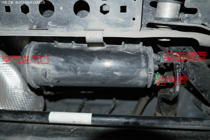 碳罐接口处就连接在碳罐空气进气口,空气进气口在右后轮上方,进气口很干净,但是细小灰尘肯定会被吸进去。长年累月吸进去的细小灰尘堵住碳罐,导致空气无法进入,电磁阀检测浓度高,一直吸气,硬生生把油箱吸上去了