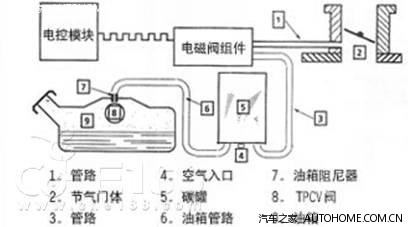 当车辆熄火后,油箱内的汽油蒸汽由一根导管引入碳罐,被具有吸附性的活性炭储存于碳罐之中。引擎再次启动之后,感应器检测油气达到一定浓度电磁阀开始吸气,位于碳罐和进气歧管之间的电磁阀打开,进气歧管内的真空产生作用力将碳罐中的汽油蒸汽吸入进气歧管参与燃烧,以此达到环保和节约燃料两重目的。