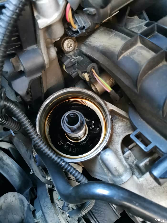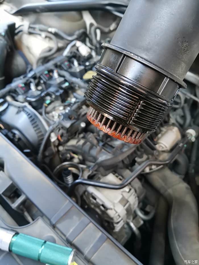 松开机滤壳,等机油回流,电子机油尺变成了缺一格,截留机油至少125ml。打开机滤后,可以看到底座上有比较深的机油,一会就流干了