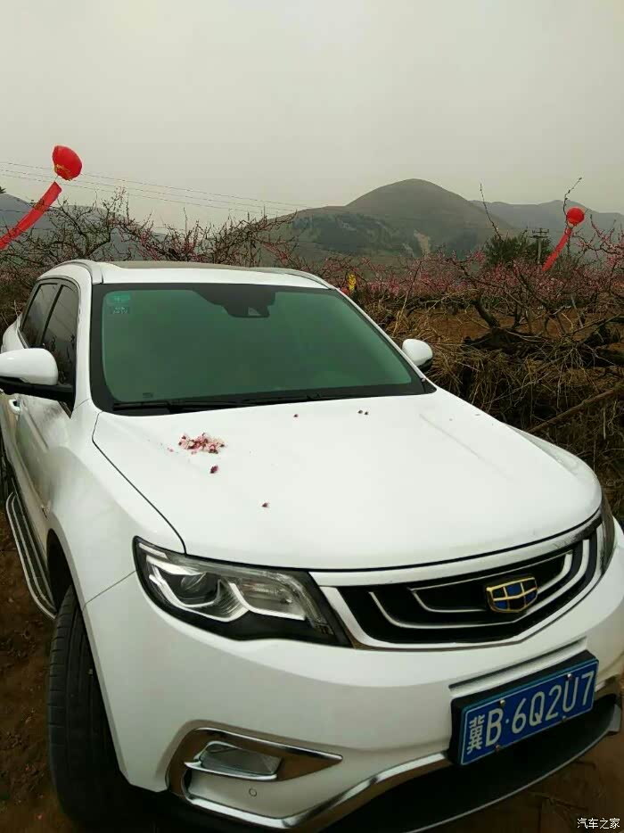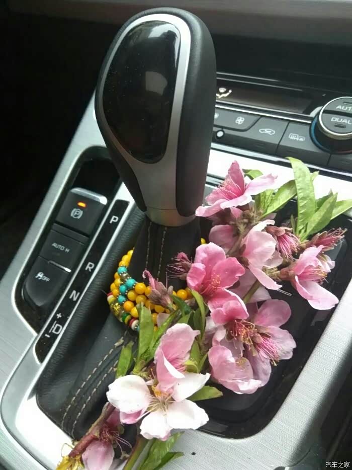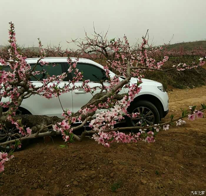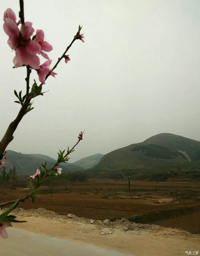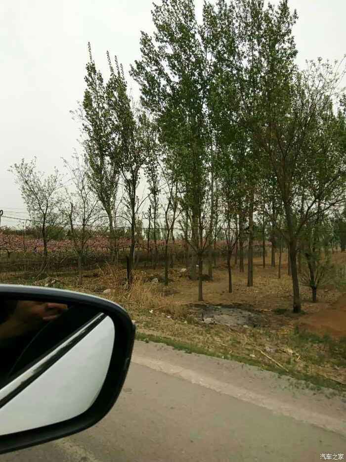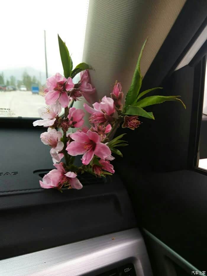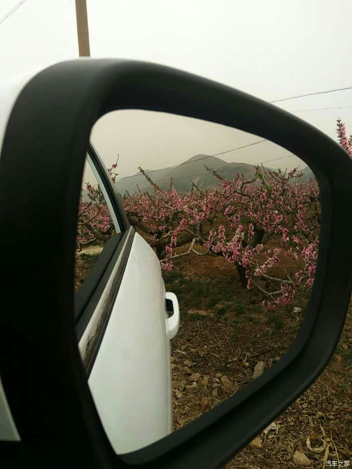 准备回家啦!看,倒车镜里的桃花在向我招手呢!再见了!我的桃花源。