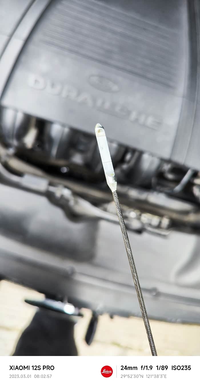 然后新加了4升多点的机油,刚好够到机油尺的下限。当时感觉有点奇怪,这次用的量比较多,还以为抽的比较干净。