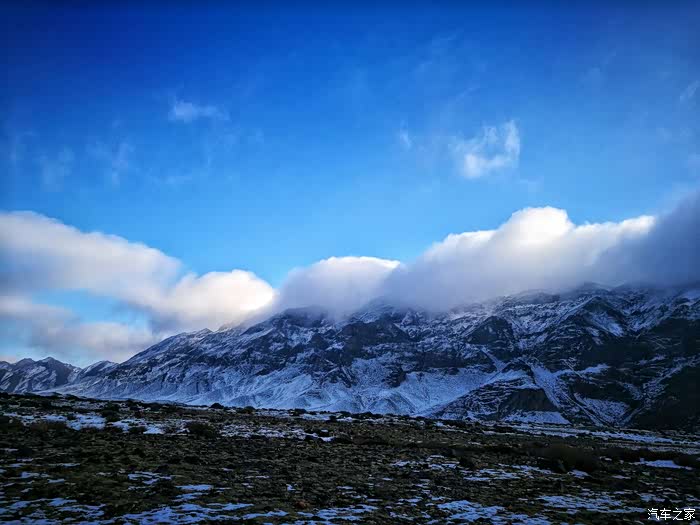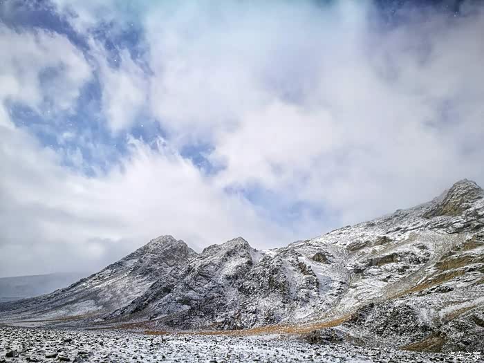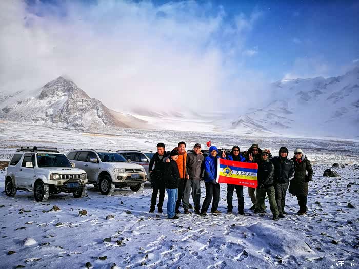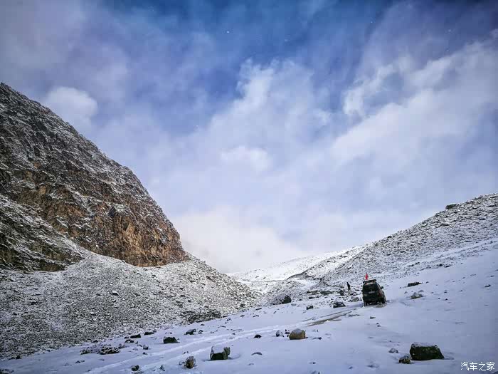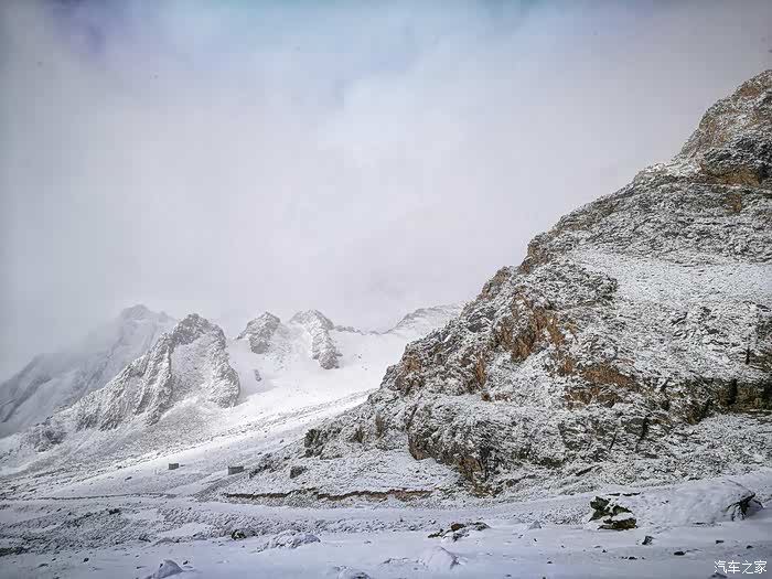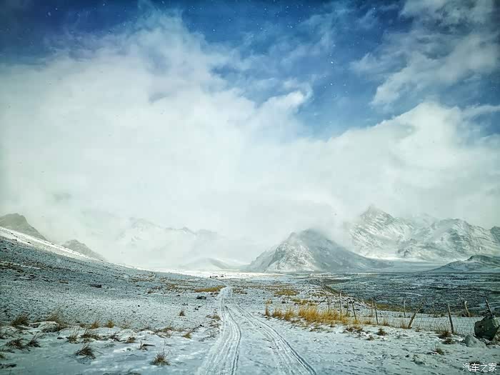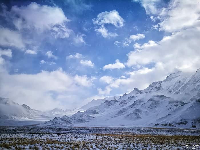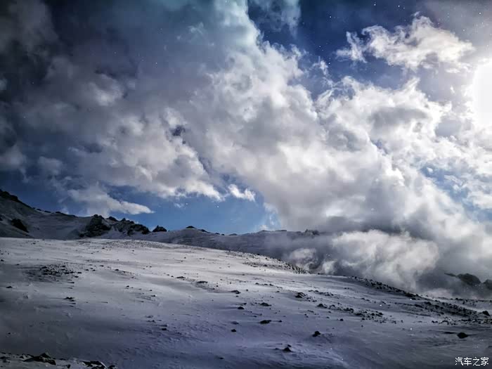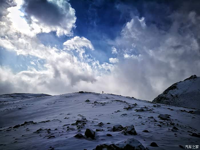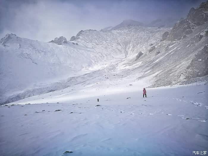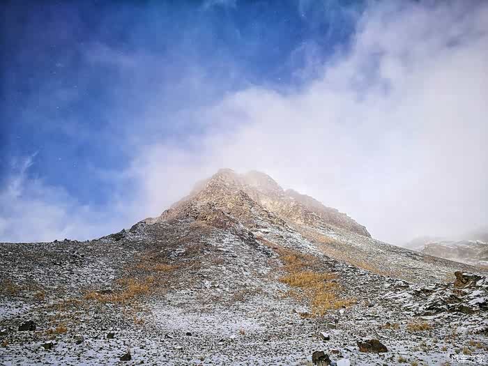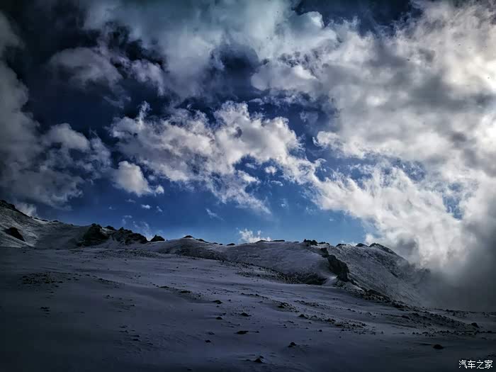 由于冬季山上风雪较大,车队行至海拔3200米处路基被风吹雪掩盖厚达1.5米深,车是过不去了只好下车徒步攀登至山顶。只见四处白雪皑皑,蓝天被云雾时而遮闭,时而露出,近在咫尺的雪山显得格外神圣而神秘。