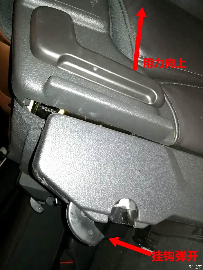 用力向上扳动把手,下方的挂钩自然弹开,座椅就翻转了,往往都是扳手用了很大的力,而这个挂钩还是无法弹开,导致座椅不能翻转。主要是挂钩里面有污渍,不能在把手向上提的时候,自动弹开导致的。