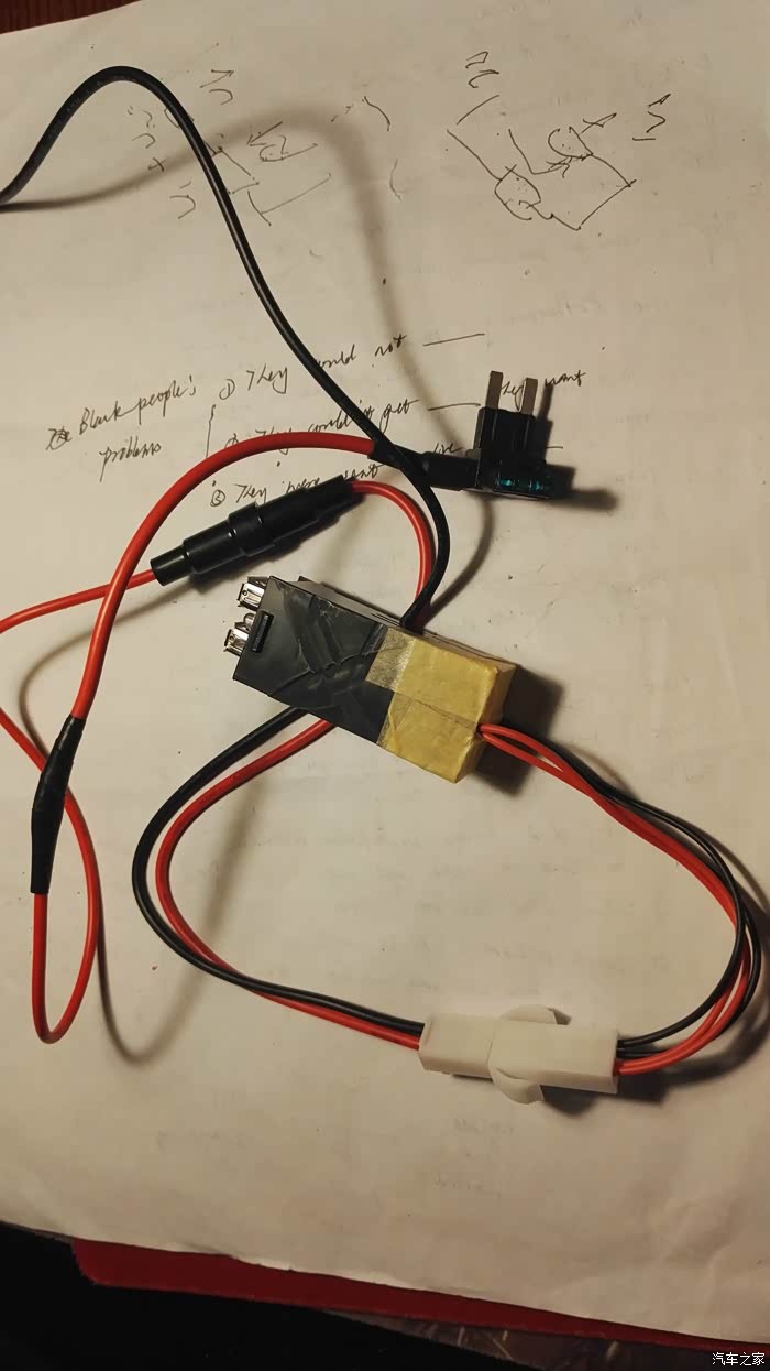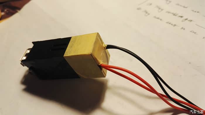 红线跟小号取电器相连,用焊锡焊好,再用黑胶布包好。