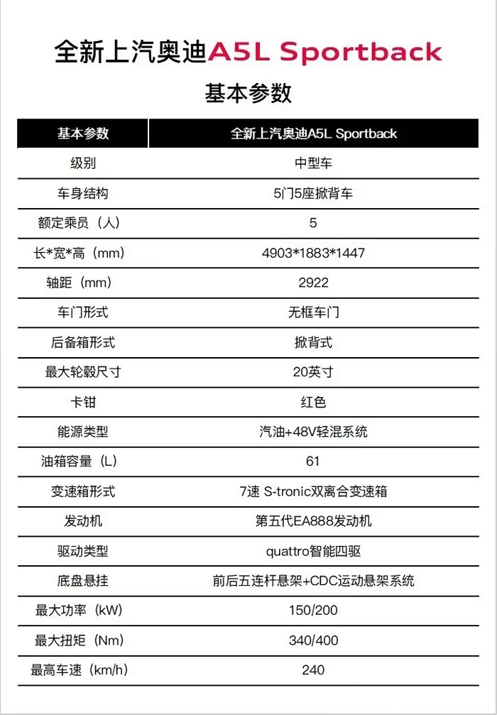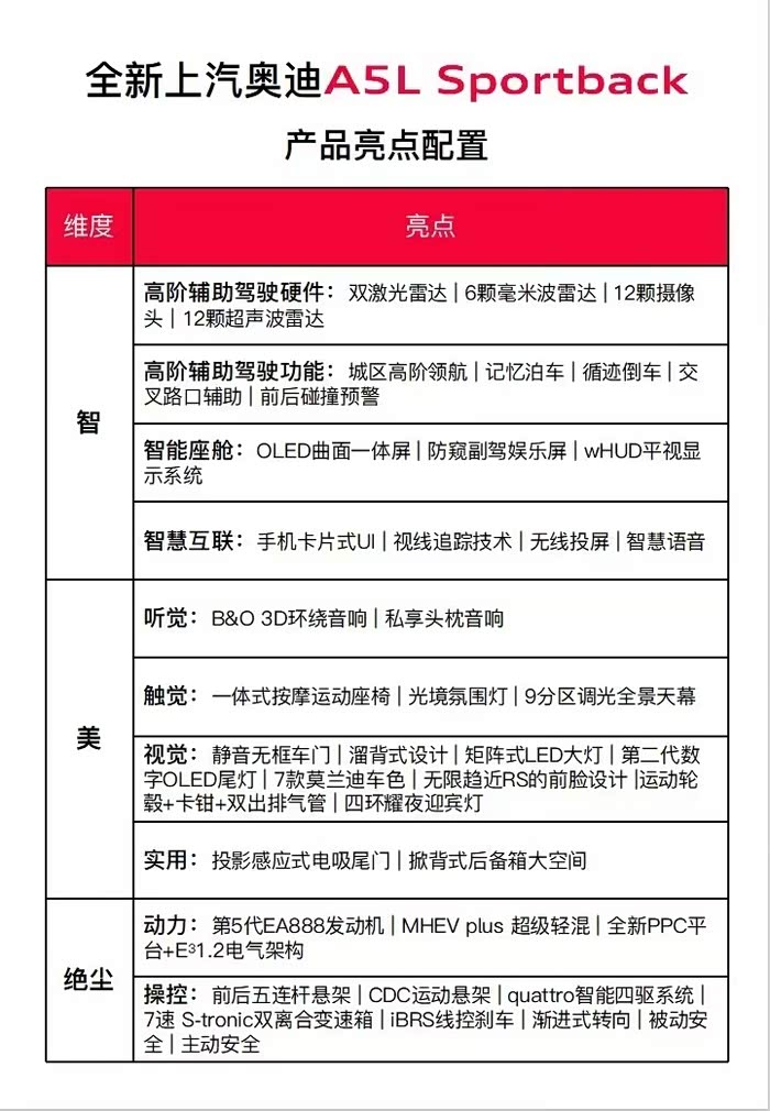 之前只是了解了上汽奥迪A5L的外观和内饰,并没有进一步去了解它的其他信息。今天看了官方配置图,感觉配置还是挺好的(就是不知道是不是高配才有那么丰富)。