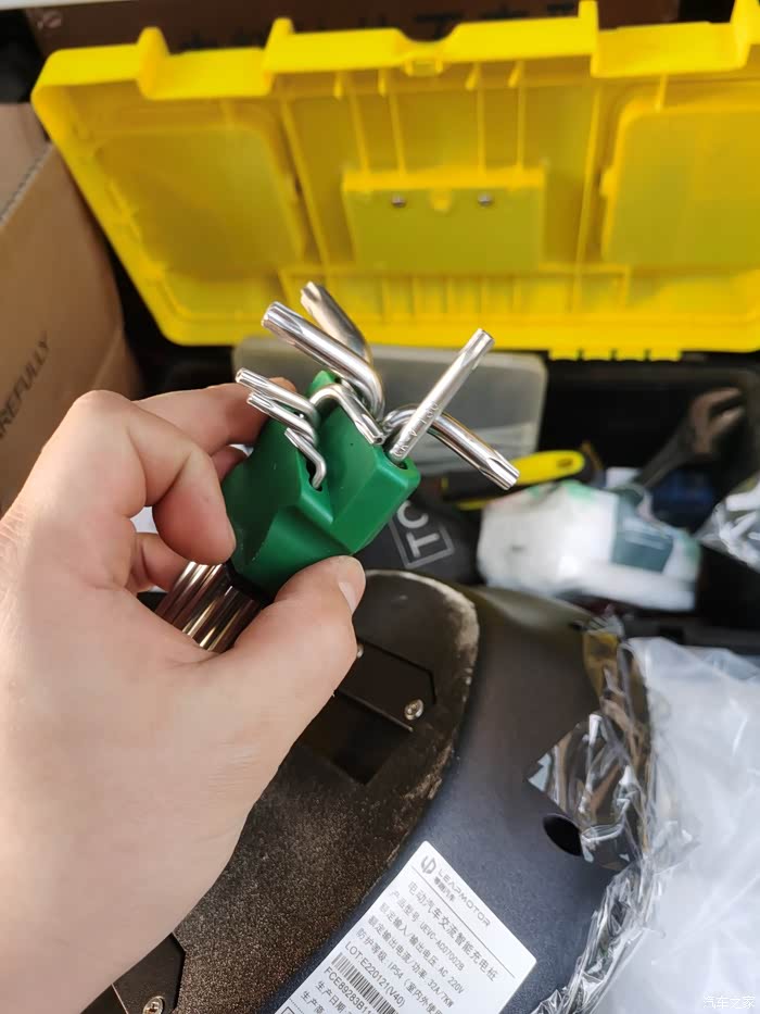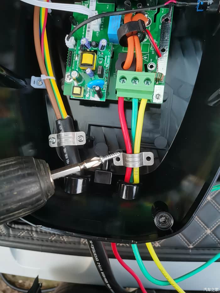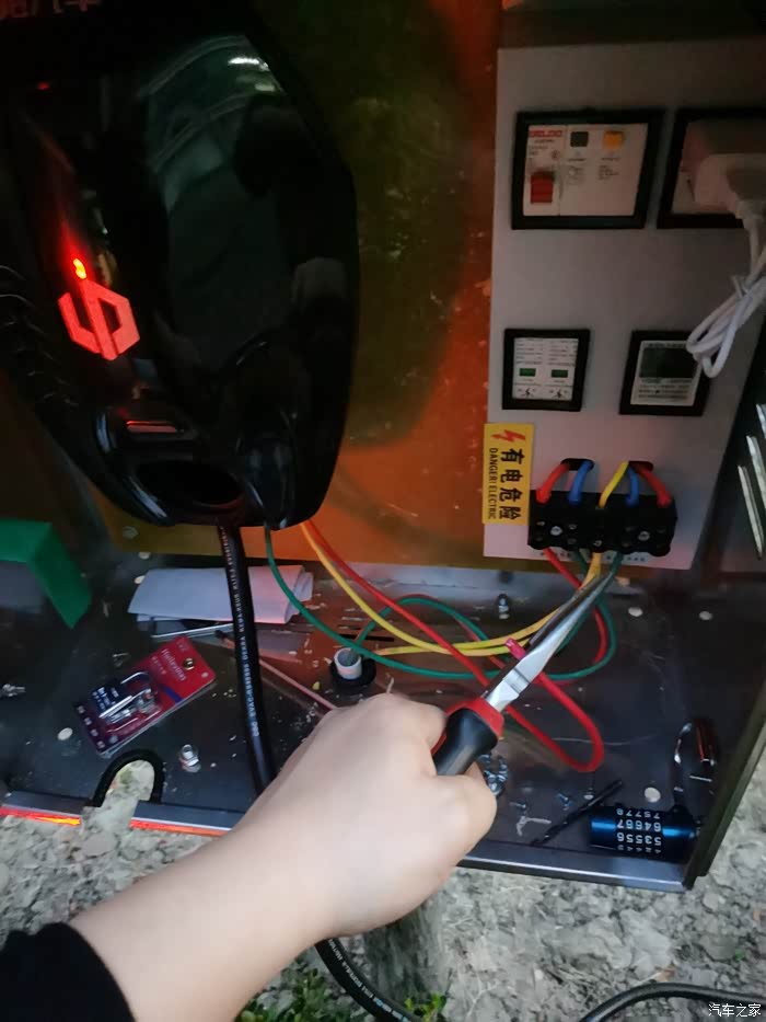 拆卸充电桩面板,准备接入电源线和调至插枪即充电模式。固定面板的螺丝好像是T20梅花扳手的。