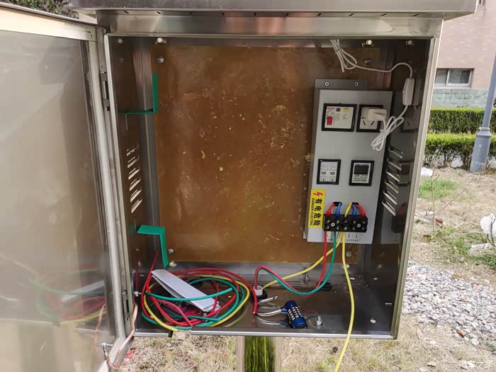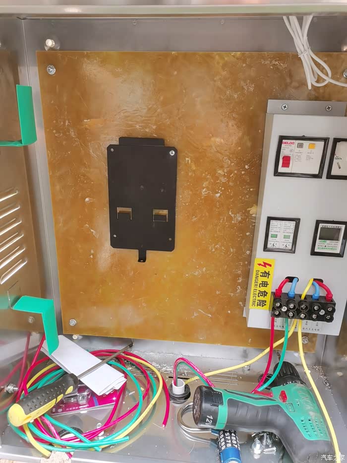 电箱一览,由于充电桩内部结构简单 我加了一套电路组合电器,有微型电表,10/16插口,浪涌保护器,空气开关。线材方面7kw充电桩6平方线足以。