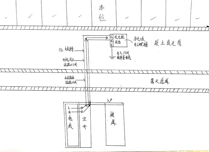 布线走线草图,家里有两个车位。本来想装在最右侧绿化带旁边大树下的车位的。最后顺从了家里老父亲,直装在正对大门的第一车位。
