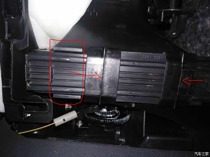 躺在副驾的地板上,拿起手机的手电筒。这个黑色的就是空调滤芯处。