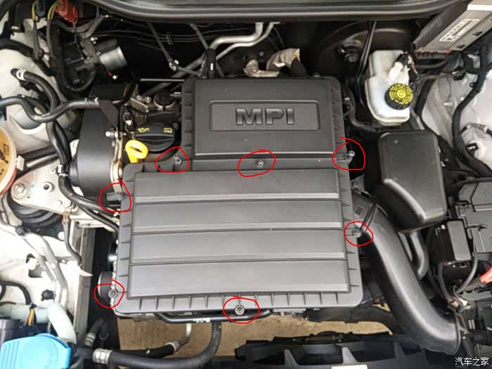 用梅花螺丝刀打开所标记的螺丝(这样就够更换空调滤芯了,如果觉得不放心,后面还有两颗螺丝可以一起打开,这样就可以拿下发动机护盖了)