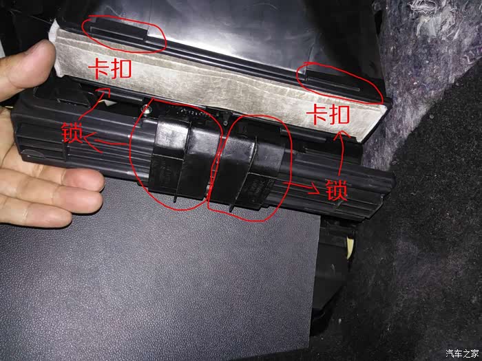 把两个卡扣推至中间解锁后,轻轻扣动盖子,将其拿下来,就会看到用旧的空调滤芯。将其拿出来!
