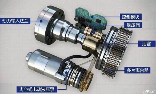 再往后面就是第五代瀚德四驱系统,也就是现在使用范围最广的四驱系统。例如沃尔沃、大众、领克等豪华品牌或合资品牌的产品都搭载了该套系统。第五代haldex中央差速器的结构主要由多片离合器、电动液压泵、活塞以及控制模块组成,整体结构与上一代四驱系统相差不大,但因为这一代四驱系统采用的是离心式电动液压泵,而且取消了蓄能器,所以整套四驱的结构更为紧凑,且对比上一代四驱系统,重量减少了1.5千克。