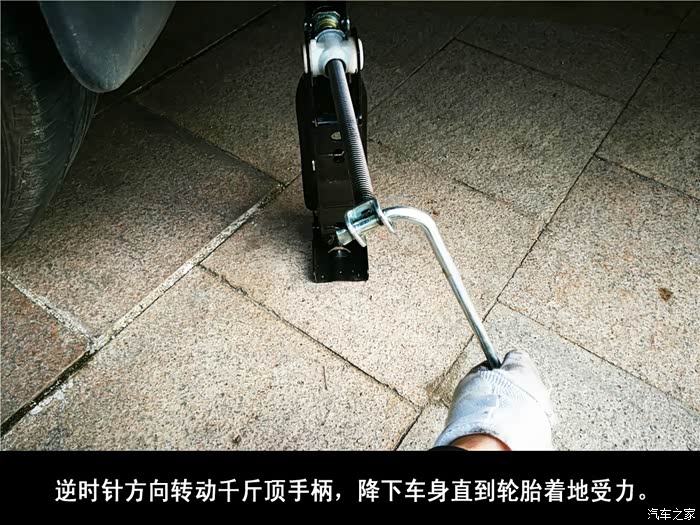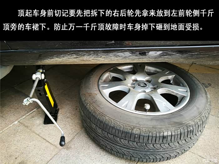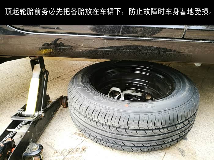 4.千斤顶顶起前一定要先把备胎或换起的轮胎先垫在千斤顶旁的车裙正下方,防止千斤顶故障,车身意外掉落时受损。