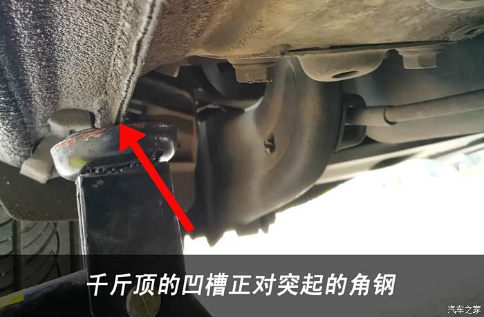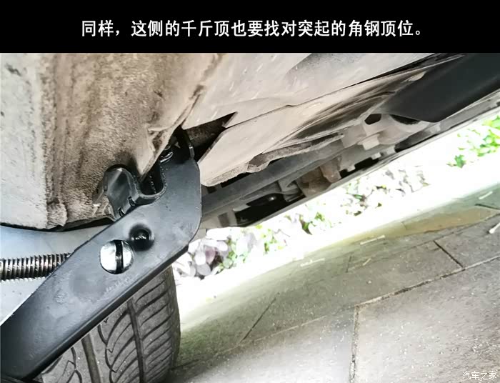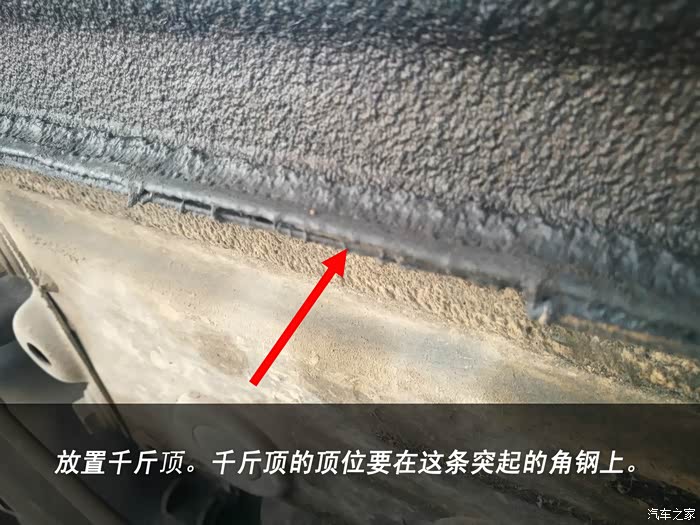 3.千斤顶一定要顶在车裙下的突起的角钢处,因为这里是专为顶车身设计的,否则会导致顶起后车身变形。