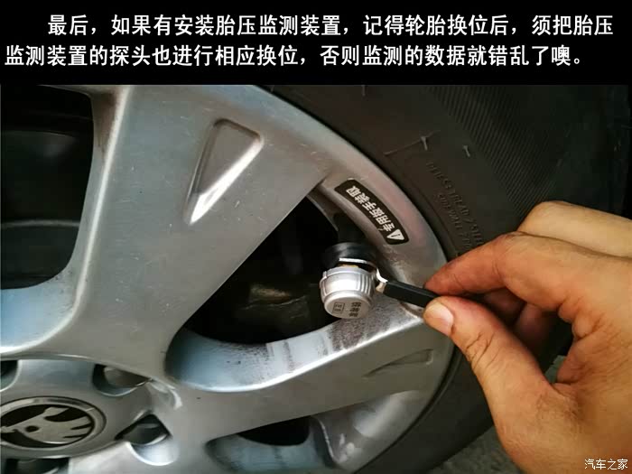 9.如果有安装胎压监测装置,在进行四轮换位后一定要记得把胎压监测装置的探头也进行相应的调换,不然数据会错乱。