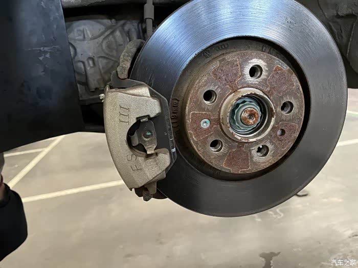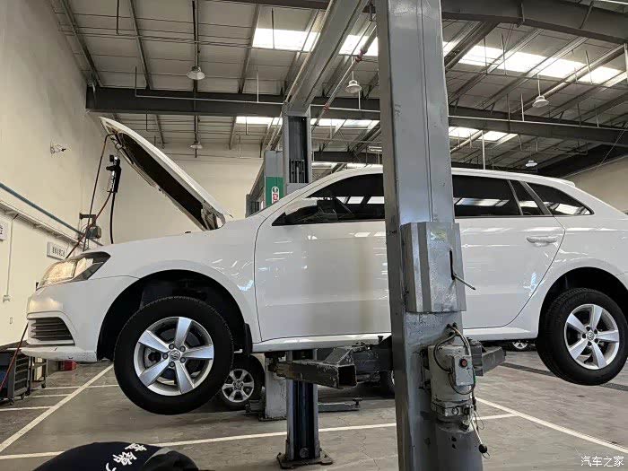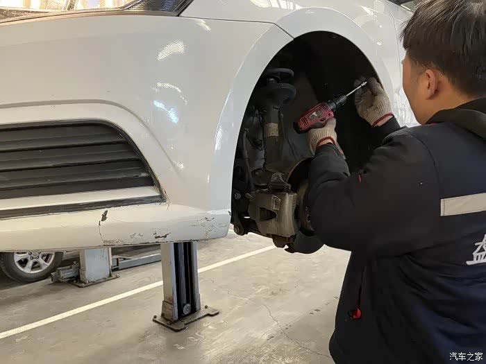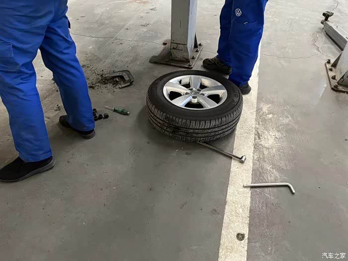 接车师傅把车开到工位上,师傅马上有条不紊的开始工作。首先把车架起来,左边的轮毂卸下来。
