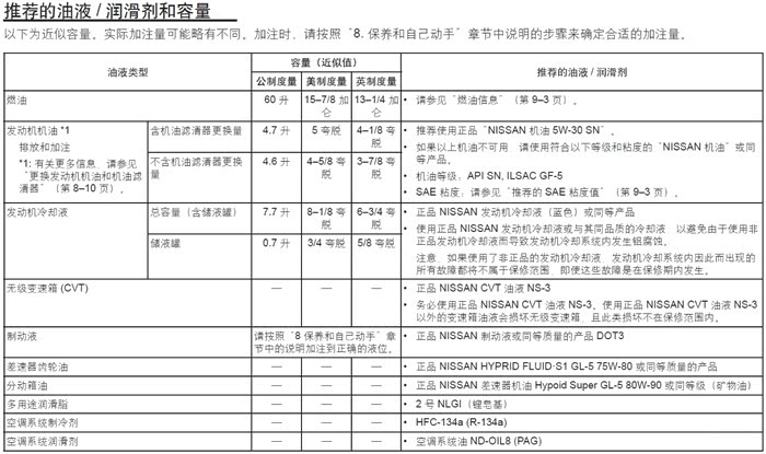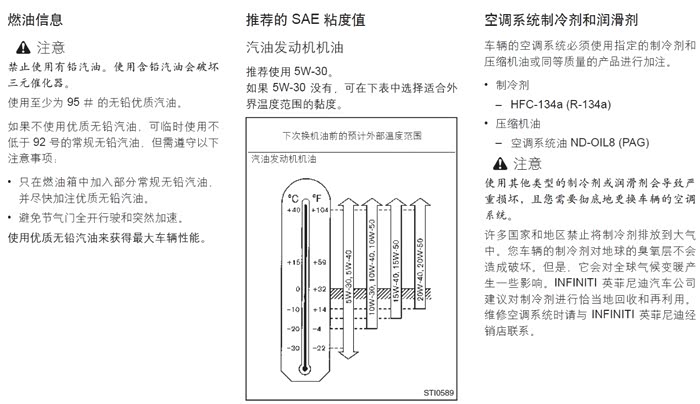 按照QX50官方的用户手册,发动机机油的要求是使用NISSAN正品5W-30 SN,或满足以下等级和粘度的产品