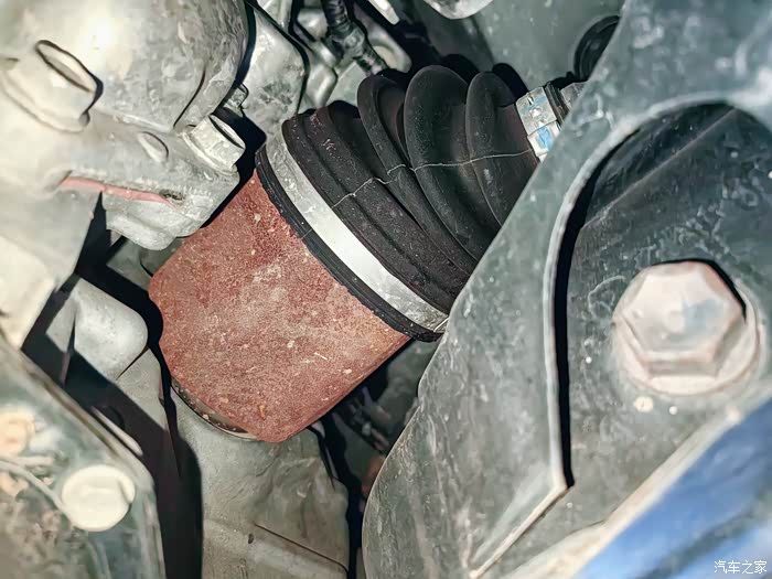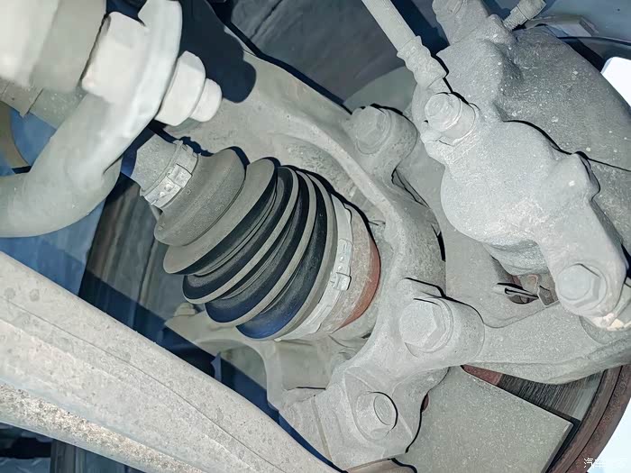 这里是前轮轮毂轴承部位的半轴护套,黑色是因为有摩擦,表面的灰尘比较少。