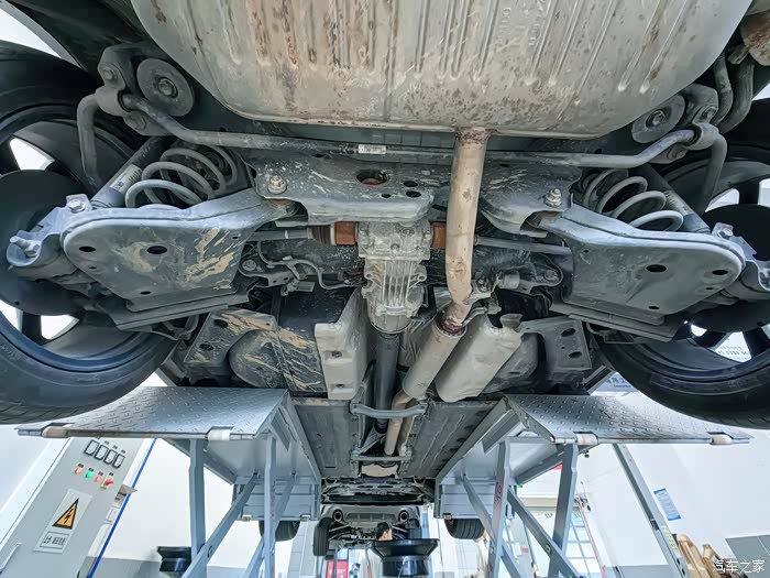 先来看下底盘后部的全景,四驱车型中间有排气管+传动轴,后面有多片离合器+差速器+半轴,东西还是挺多的。