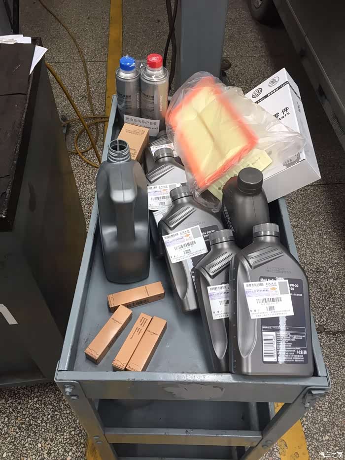 很快大黑这次的“伙食”就从仓库领过来了,机油5.5L、火花塞4根、PM2.5空调滤芯1个、空气滤芯1个、油路清洗套装一套。